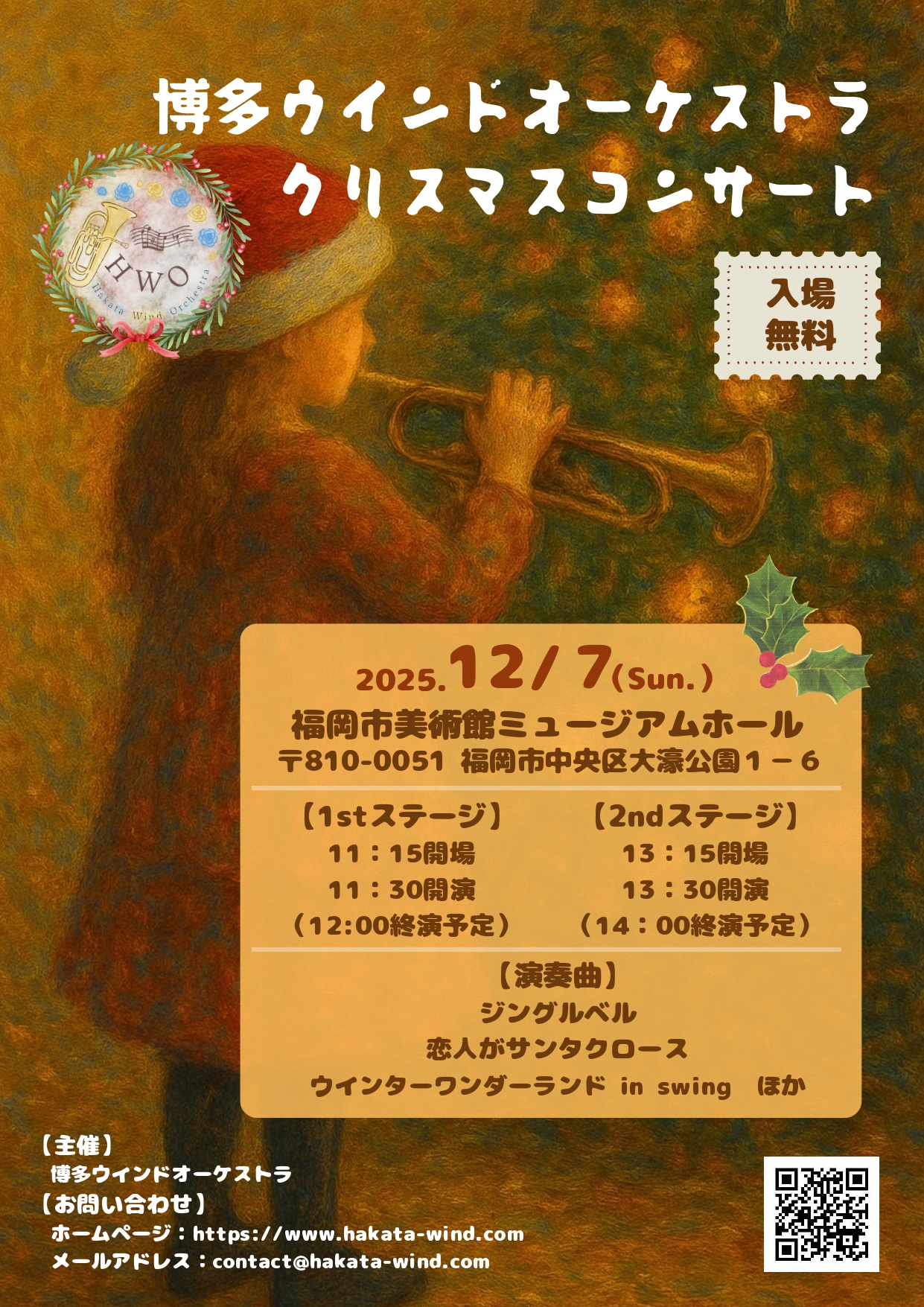 クリスマスコンサートのご案内![]() 2025年12月7日(日) 1stステージ:11時15分開場 11時30分開演 2ndステージ:13時15分開場 13時30分開演 福岡市美術館ミュージアムホール (福岡県福岡市中央区大濠公園1−6) 【電車】地下鉄空港線大濠公園駅(福岡市美術館口)3・6番出口より徒歩10分 地下鉄七隈線六本松駅2番出口より徒歩10分 【バス】西鉄バス「福岡市美術館東口」下車 徒歩3分 西鉄バス「赤坂三丁目」下車 徒歩5分 西鉄バス「福岡城・NHK放送センター入口」下車 徒歩3分 入場無料 | ||||