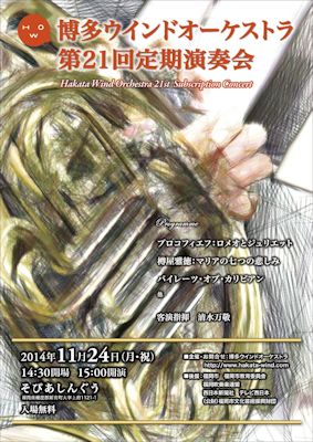 第21回定期演奏会の記録![]() 2014年11月24日(月・祝) 14時30分開場 15時00分開演 そぴあしんぐう (福岡県糟屋郡新宮町大字上府1121−1) 入場無料 指揮 清水 万敬 他