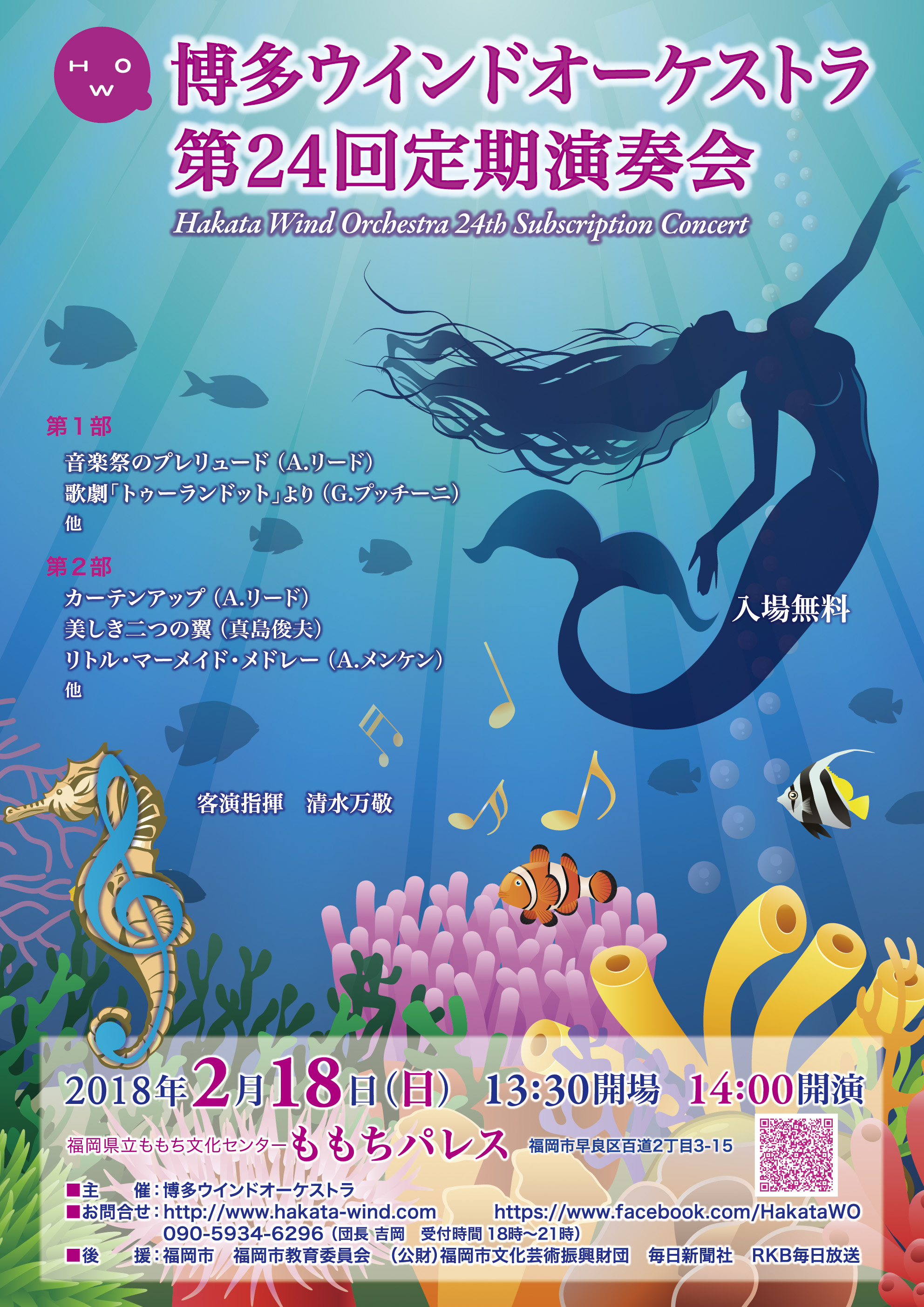 演奏会のご案内第24回定期演奏会は盛会のうちに無事終了いたしました。ご来場いただいた皆様、応援していただいた皆様に厚く御礼申し上げます。 ![]() 2018年2月18日(日) 13時30分開場 14時00分開演 福岡県立ももち文化センター ももちパレス (福岡県福岡市早良区百道2丁目3番15号) 入場無料 指揮 清水 万敬 他