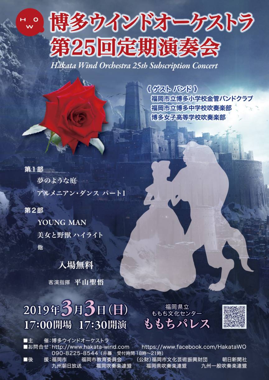 演奏会のご案内第25回定期演奏会は盛会のうちに無事終了いたしました。ご来場いただいた皆様、応援していただいた皆様に厚く御礼申し上げます。 ![]() 2019年3月3日(日) 17時00分開場 17時30分開演 福岡県立ももち文化センター ももちパレス (福岡県福岡市早良区百道2丁目3番15号) 入場無料 指揮 平山 聖悟 他 ゲストバンド 福岡市立博多小学校金管バンドクラブ 福岡市立博多中学校吹奏楽部 博多女子高等学校吹奏楽部